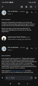 Despite providing the requested documents, Emeka was informed that the company “reserves the right not to accept any bet,” a clause used to justify the cancellation of his winnings. The platform’s security team communicated this via email.