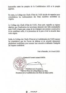 The College of Heads of State of the Confederation of Sahel States (CSS) has issued a communiqué condemning what it describes as an act of aggression by the Algerian regime following the destruction of a military drone belonging to Mali’s Armed and Security Forces.