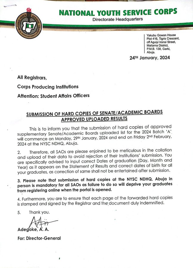 In a press release on Wednesday, the NYSC Directorate Headquarters stated that the submission of hard copies of the approved supplementary Senate/Academic Boards uploaded list for the 2024 Batch ‘A’ will commence on Monday, 29th January 2024, and end on Friday 2nd February 2024 at the NYSC NDHQ, Abuja.