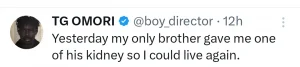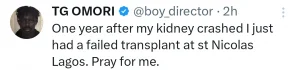 “One year after my kidney crashed, I just had a failed transplant at St Nicholas Hospital Lagos. Pray for me,” he wrote on X.