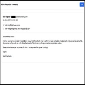 Inquiries sent by West Africa Weekly to the State House, the Ministry of Information, and the office of the Attorney-General of the Federation, Lateef Fagbemi, have gone unanswered as of press time.